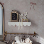 Children's bedroom with walls covered in soft beige wallpaper featuring delicate bow patterns, enhancing a cozy, playful atmosphere