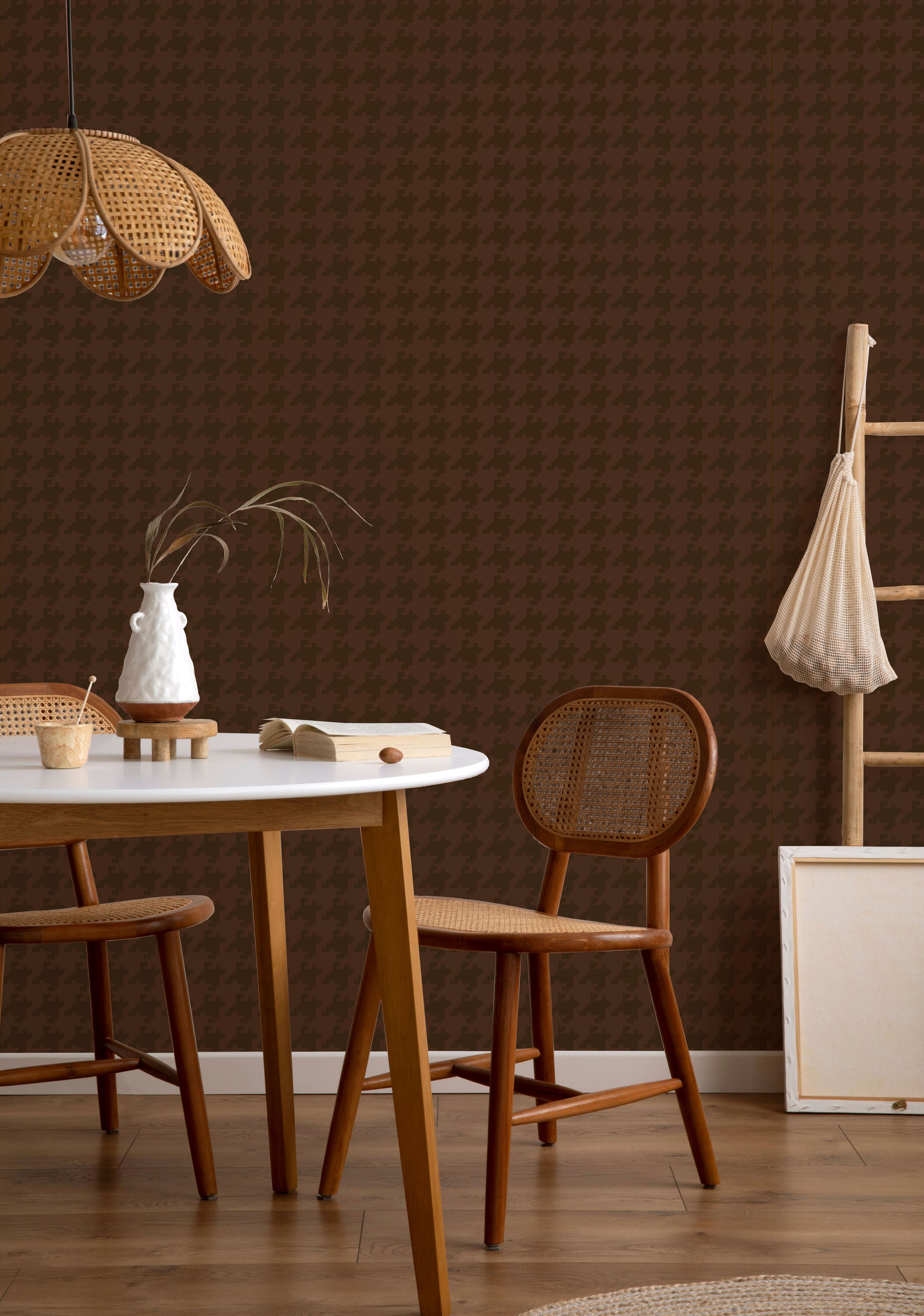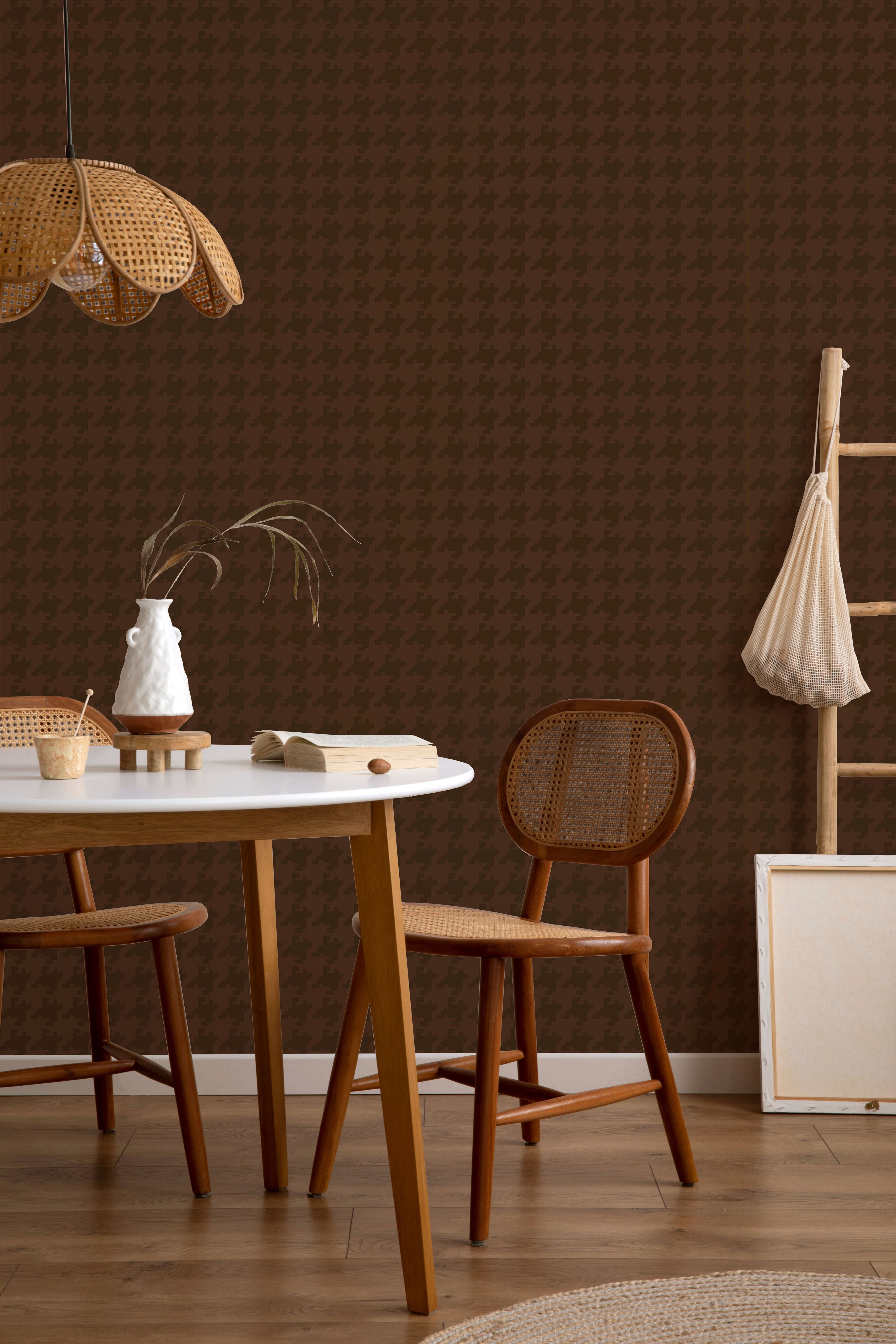 Give your space a timeless, tailored look with our Brown Houndstooth Wallpaper. This classic check pattern is printed in rich chocolate tones and can be fully customized to any color combination you like. Its crisp geometric repeat makes it a beautiful choice for accent walls, offices, dining rooms, and modern cottage interiors. Available in peel and stick or traditional unpasted wallpaper.