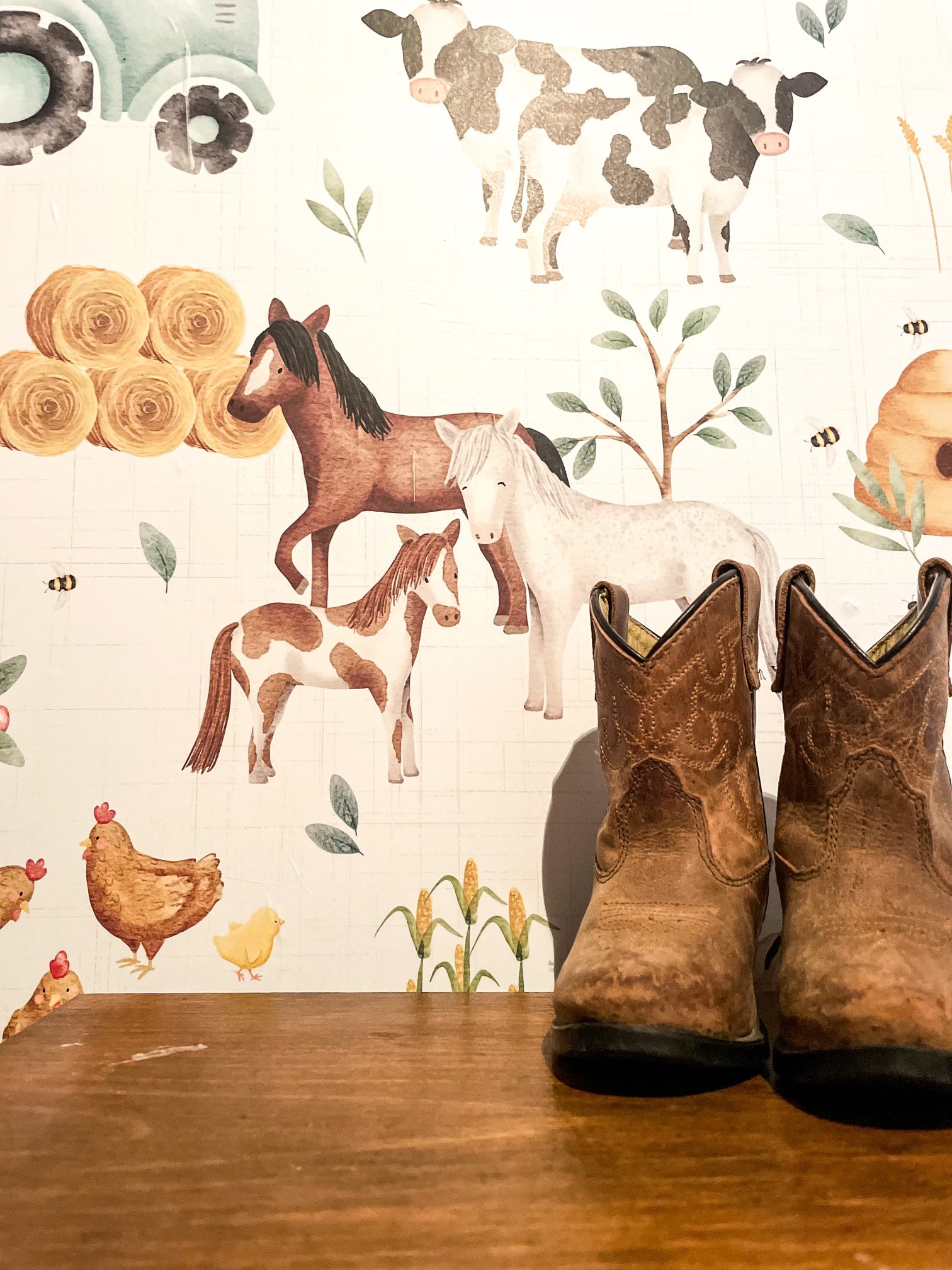Farm animal peel and stick removable wallpaper is a perfect nursery wallpaper made from premium woven texture wall fabric with an adhesive backing so your high quality peel and stick wallpaper for walls can be applied (and removed) with ease. This Farm Animal wall paper features horses, pigs, cows, chickens, tractors, bees, apple trees, corn and hey bales.
