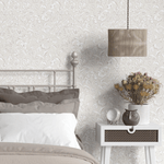 A close-up view of a beige wallpaper with a delicate floral pattern in white and light grey. The design features intricate flowers and leaves, creating a soft, elegant, and vintage-inspired look.
