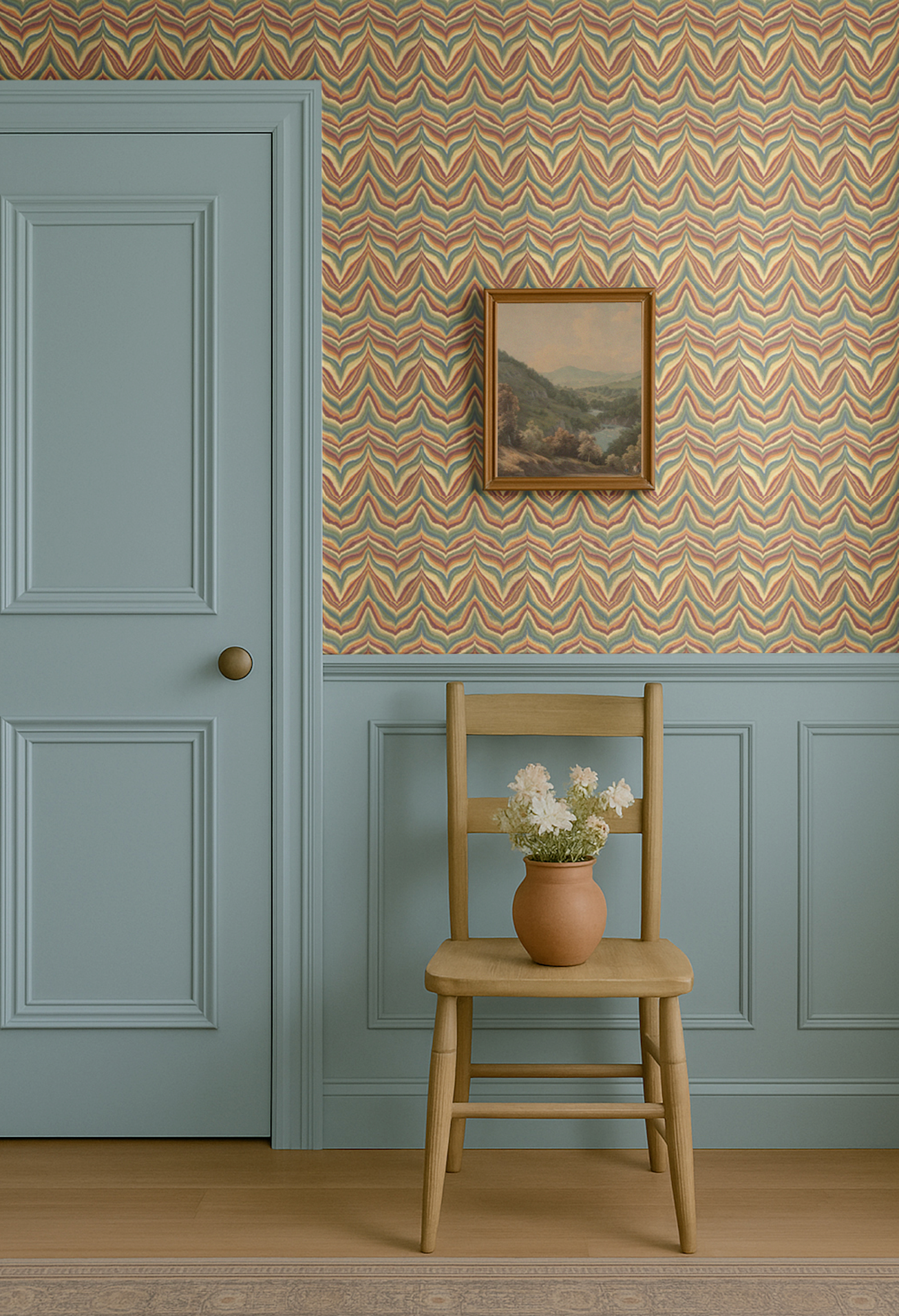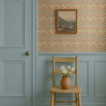 Our designer exclusive Mesa Wave wallpaper is a bold, flowing stripe design in sunset hues of rust, ochre, sage, and faded turquoise. This wallpaper captures the warmth and rhythm of desert mesas, with a retro twist that feels both grounded and playful. The soft, undulating lines mimic woven textiles or sandstone ridges—perfect for adding movement and color to any space.