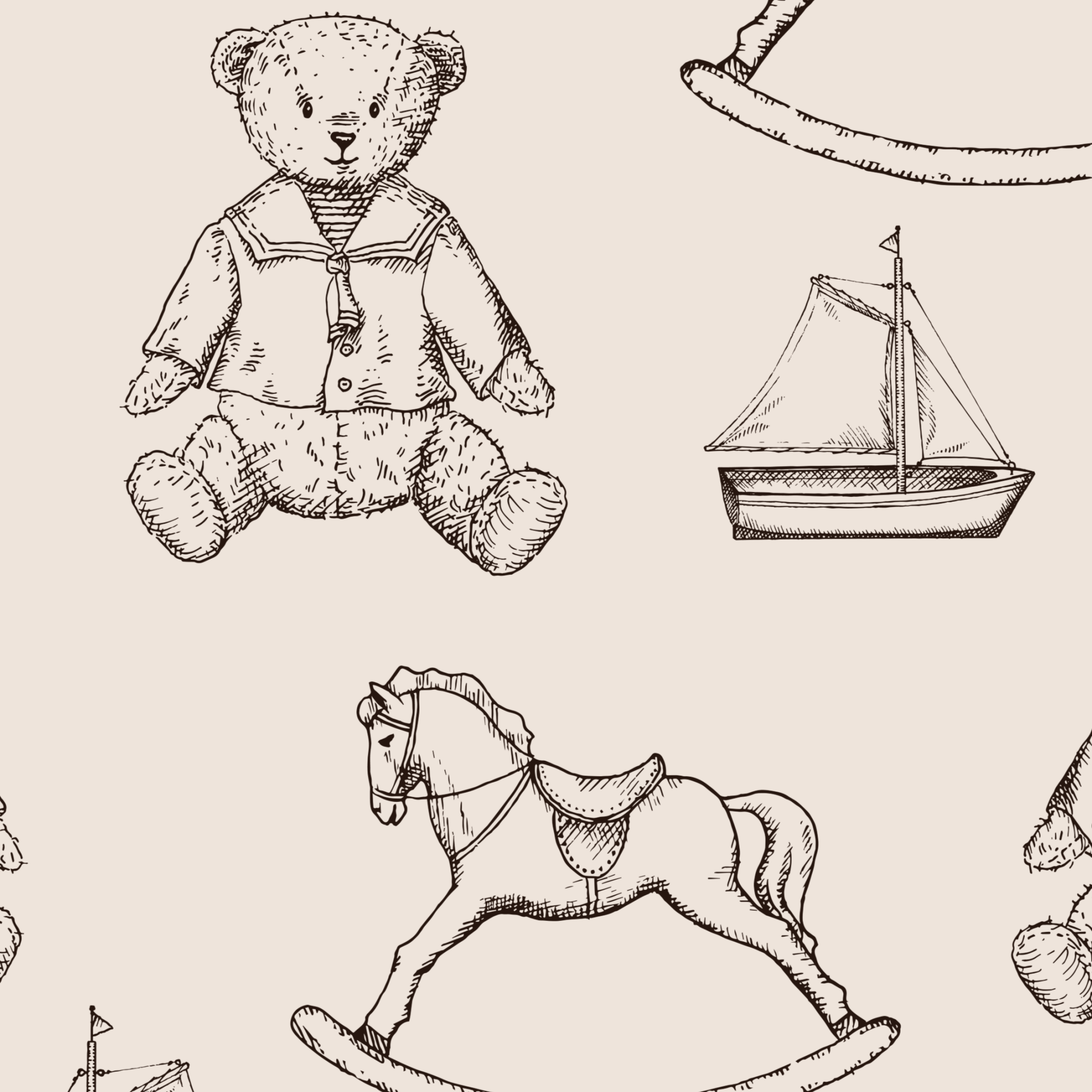 Bring a touch of timeless nostalgia to your baby’s room with our Vintage Toys Wallpaper. Featuring hand-drawn illustrations of teddy bears, rocking horses, and sailboats, this wallpaper creates a playful and charming atmosphere ideal for nurseries, kids’ rooms, or cozy vintage-inspired spaces.