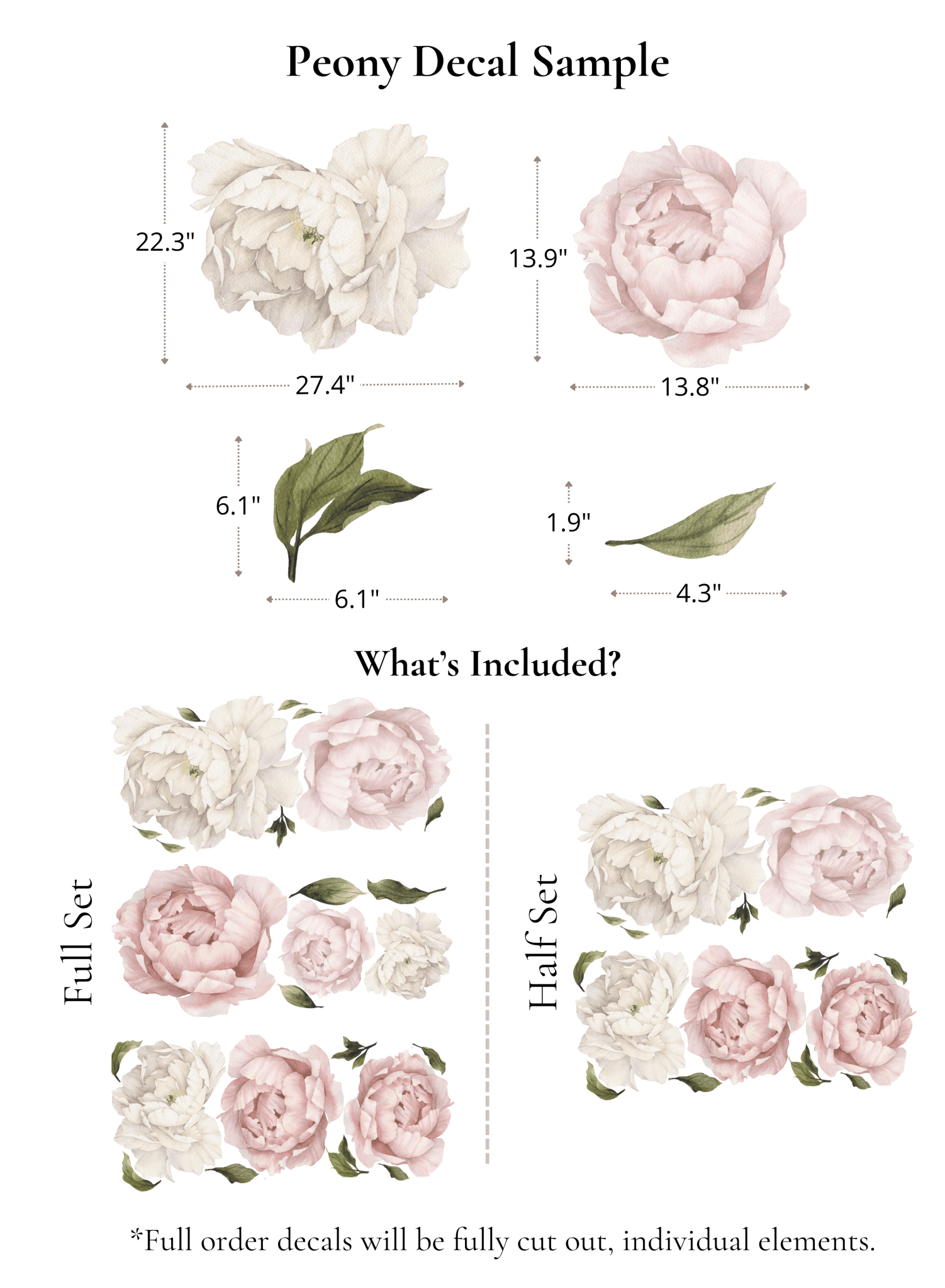 Decals vary by product. Please refer to each product description for sizing details, and number of decals included per set.