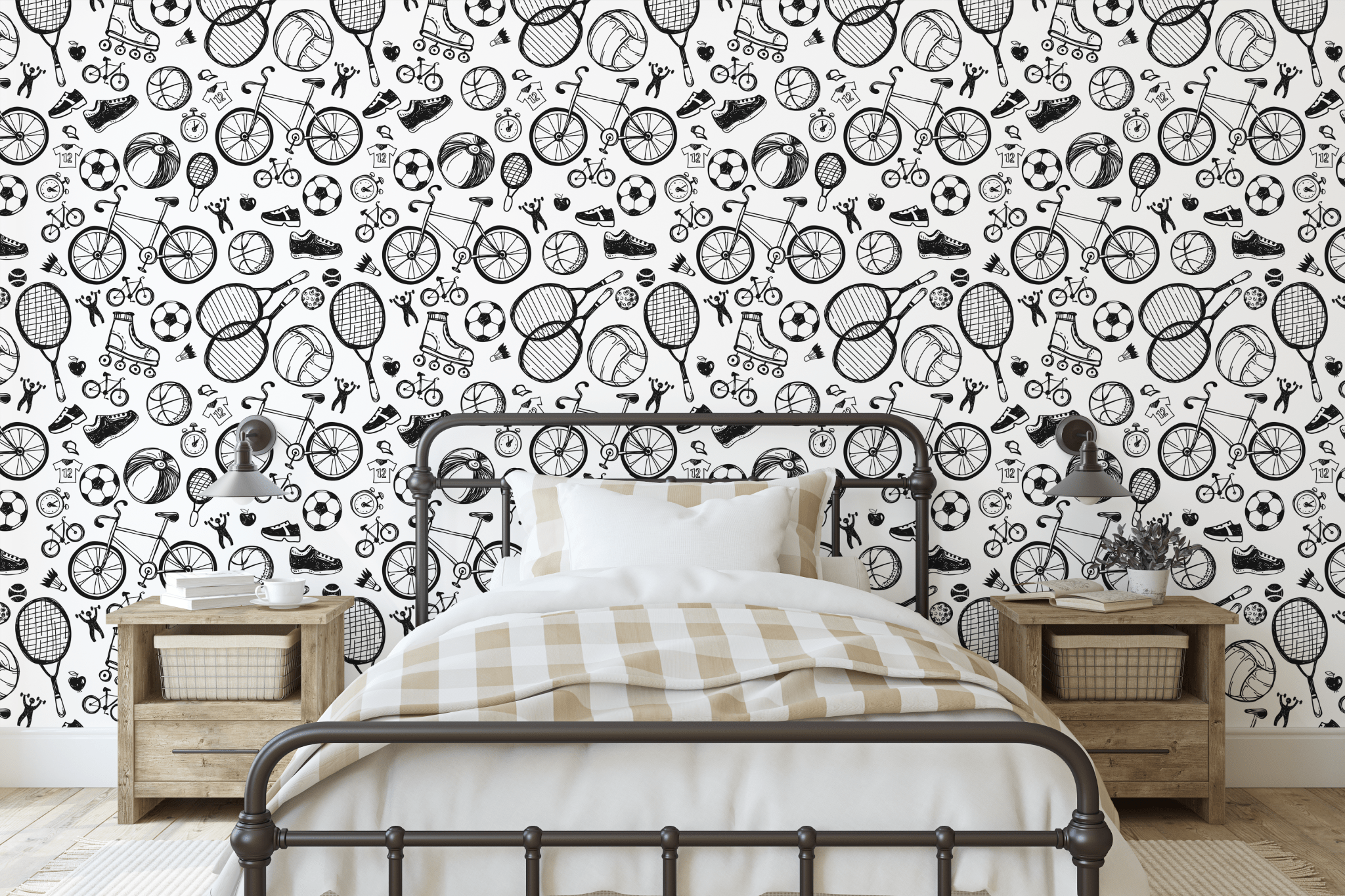 Add a nostalgic sports vibe to your kids' or teenagers' room with this retro sports wallpaper! Featuring hand-drawn icons like bicycles, soccer balls, tennis rackets, and more, this wallpaper is a fun choice for playrooms, bedrooms, or study areas. Available in customizable colors to suit your decor style, it’s made with high-quality, eco-friendly materials for a long-lasting and vibrant design. Easy to install and remove, making it renter-friendly and perfect for families who love stylish, practical solutions.