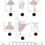 Full Sheet: Includes 17 ballerina themed wall stickers, ranging in size from 5" tall to 11" tall.