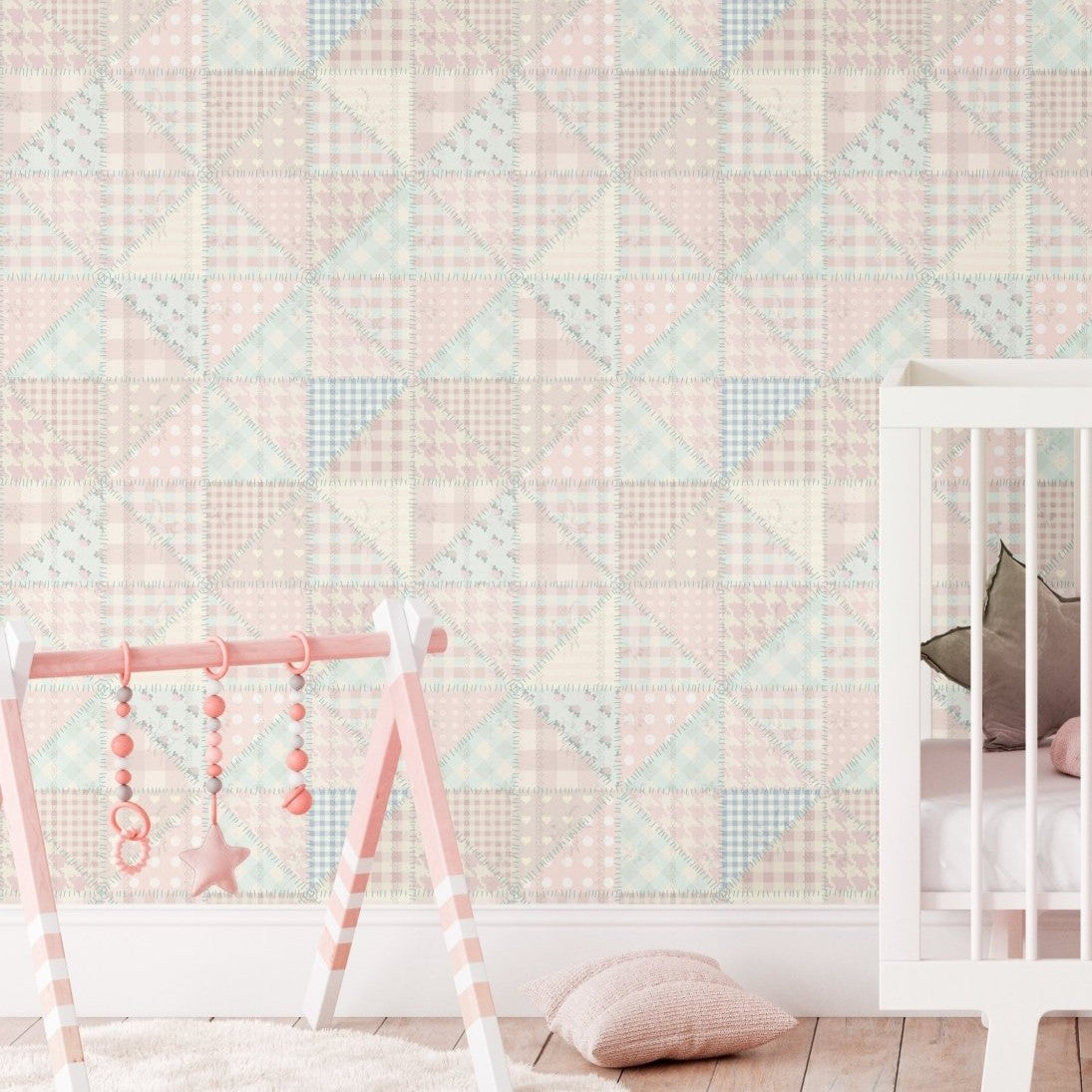 Inspired by hand-stitched quilts, this pastel patchwork wallpaper adds a cozy, homespun feel to your space. Perfect for nurseries, bedrooms, or cottage-style interiors.