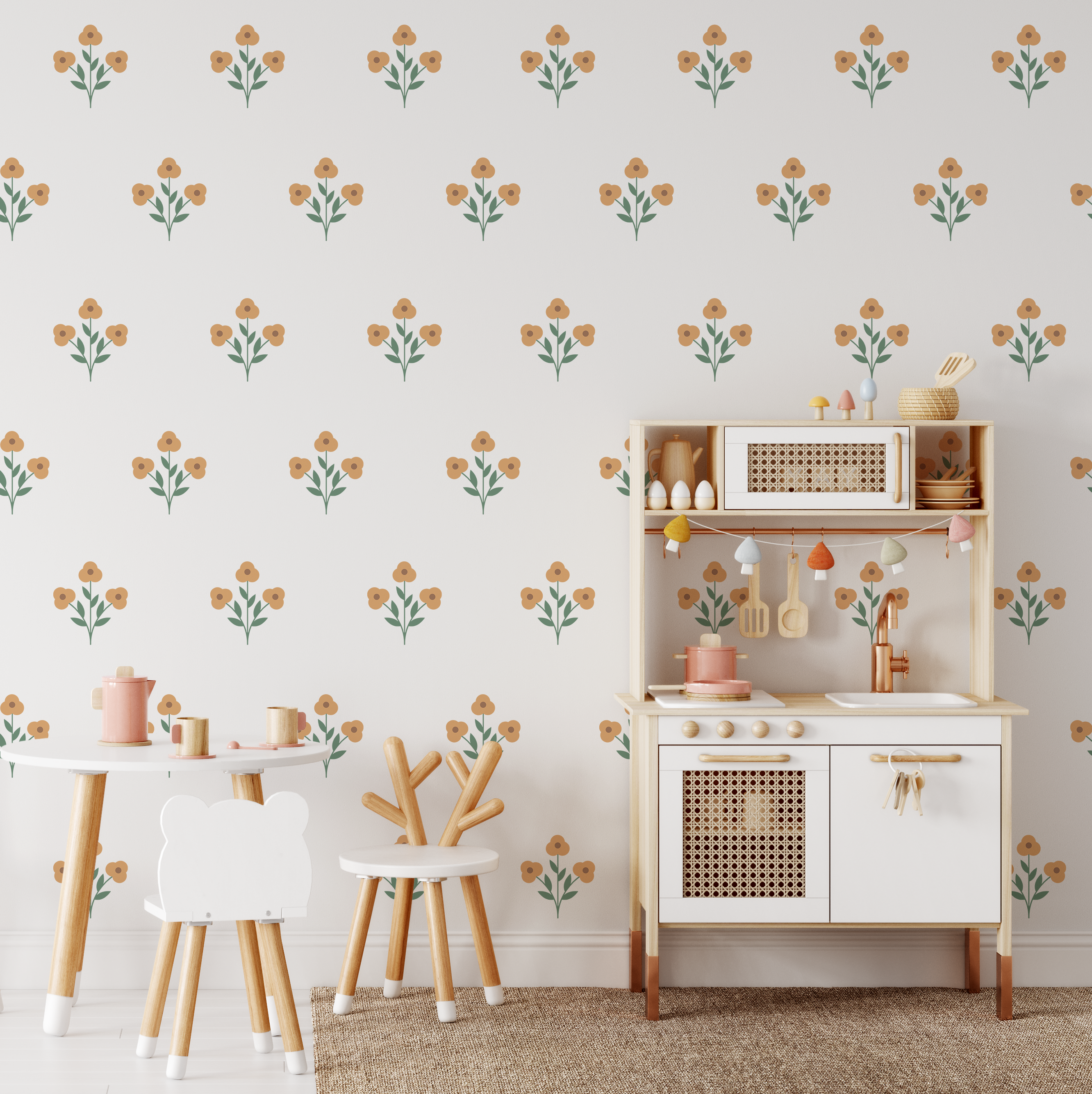 Sweet Sprig Decals feature a simple, cheerful floral design with soft orange blooms and muted green stems. These minimal flower wall decals are perfect for adding a gentle pop of color to nurseries, kids’ rooms, playrooms, or calm, neutral spaces. The design feels light, airy, and timeless, making it easy to style alongside modern, Scandinavian, or cottage-inspired decor.