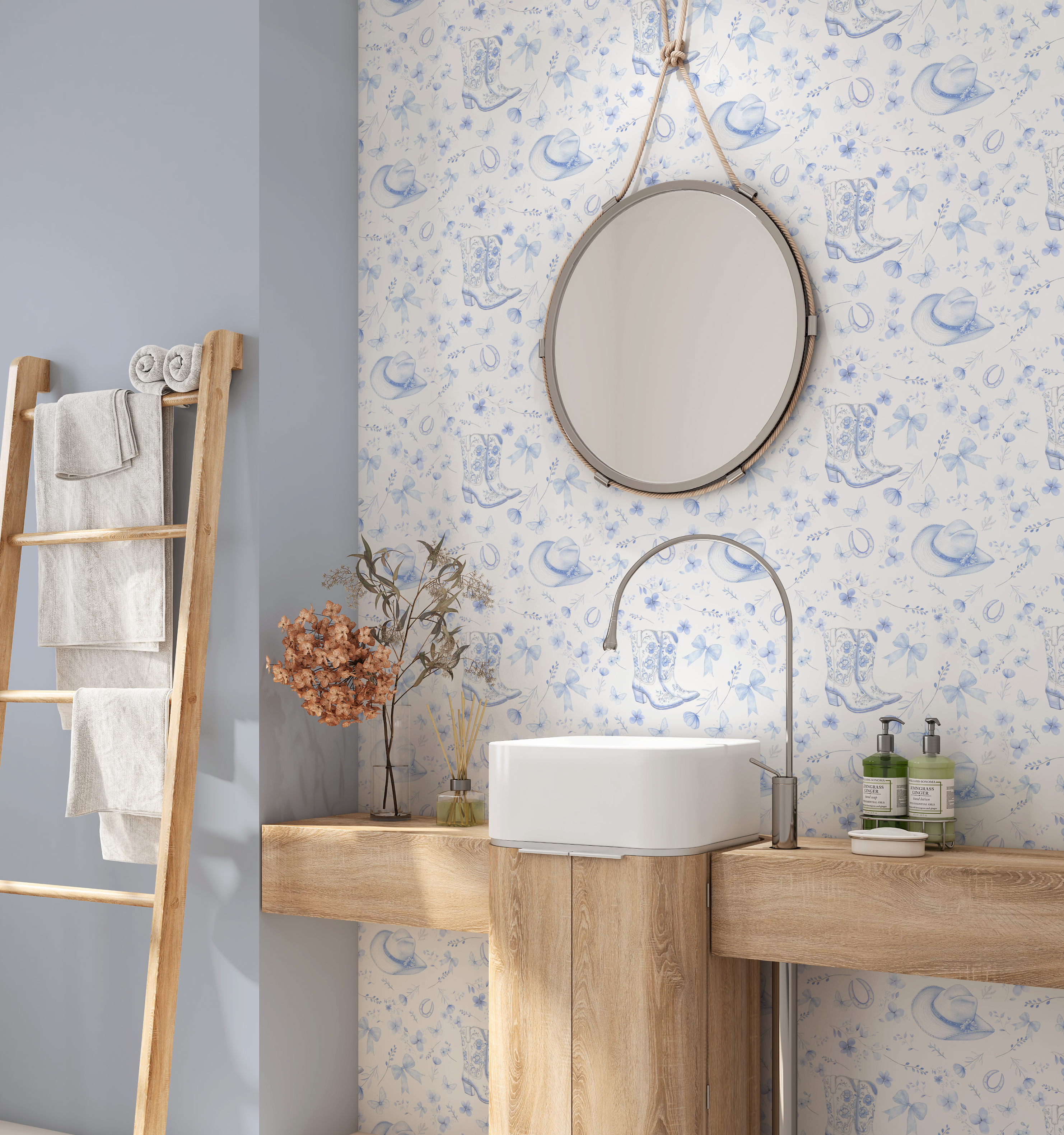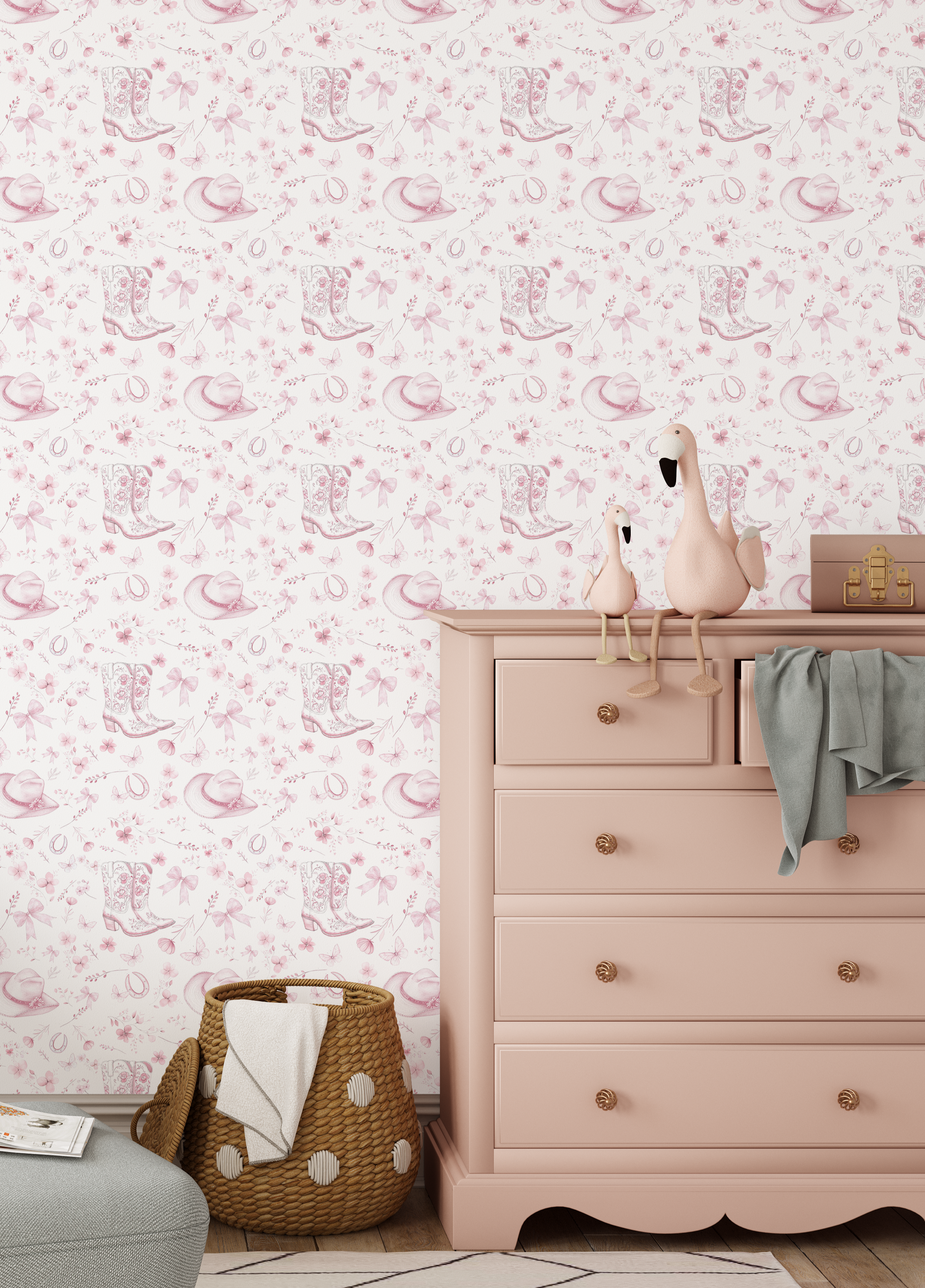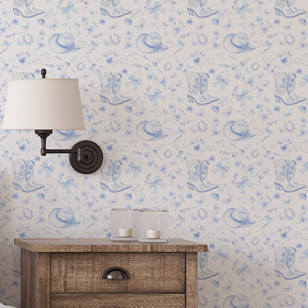 Western Bloom Wallpaper features hand-drawn cowboy boots, hats, bows, and horseshoes surrounded by delicate florals in soft pink or blue. The design captures the Coastal Cowgirl aesthetic, blending Western icons with a feminine, whimsical feel.